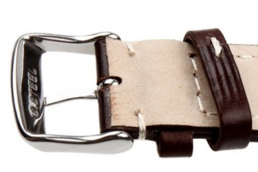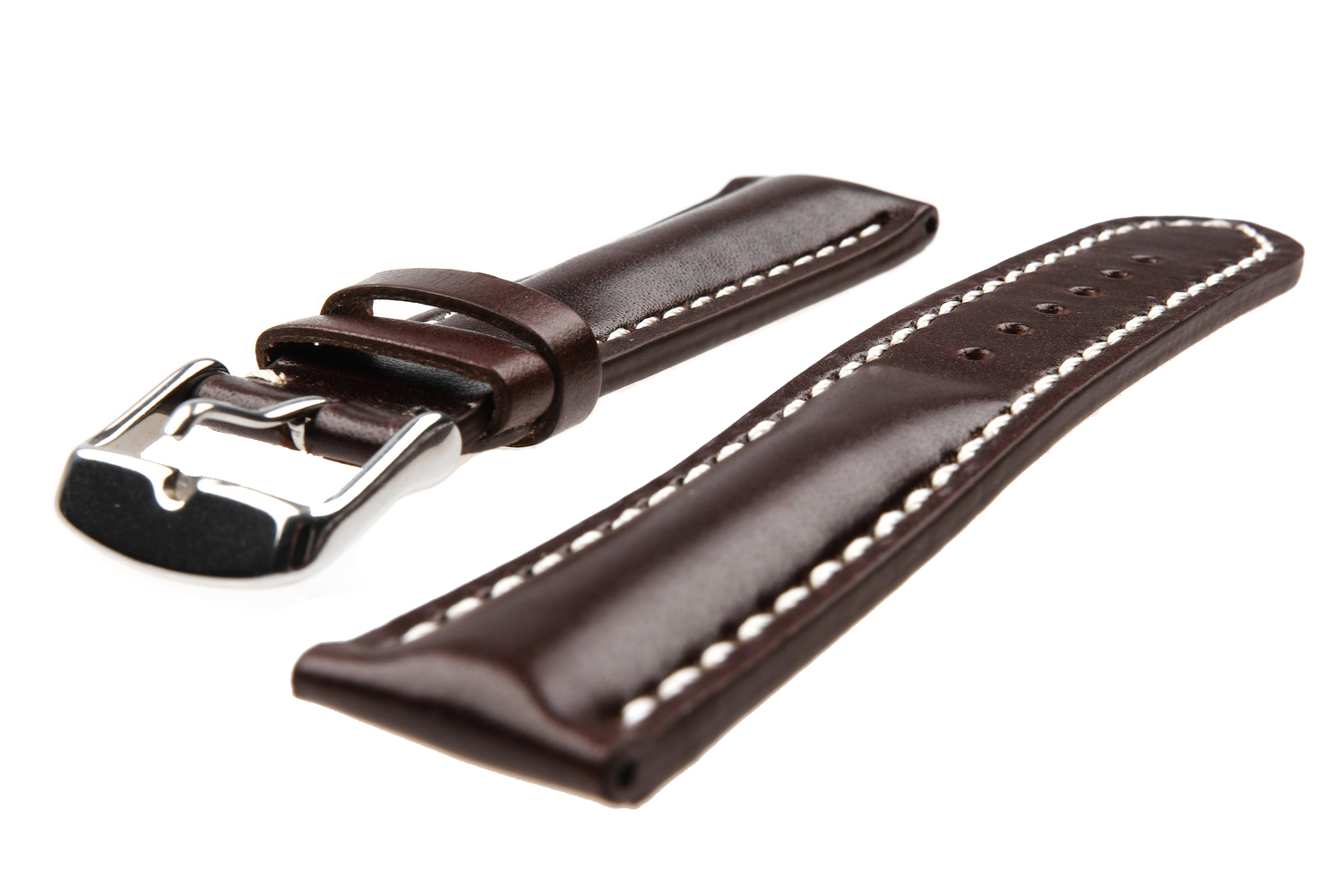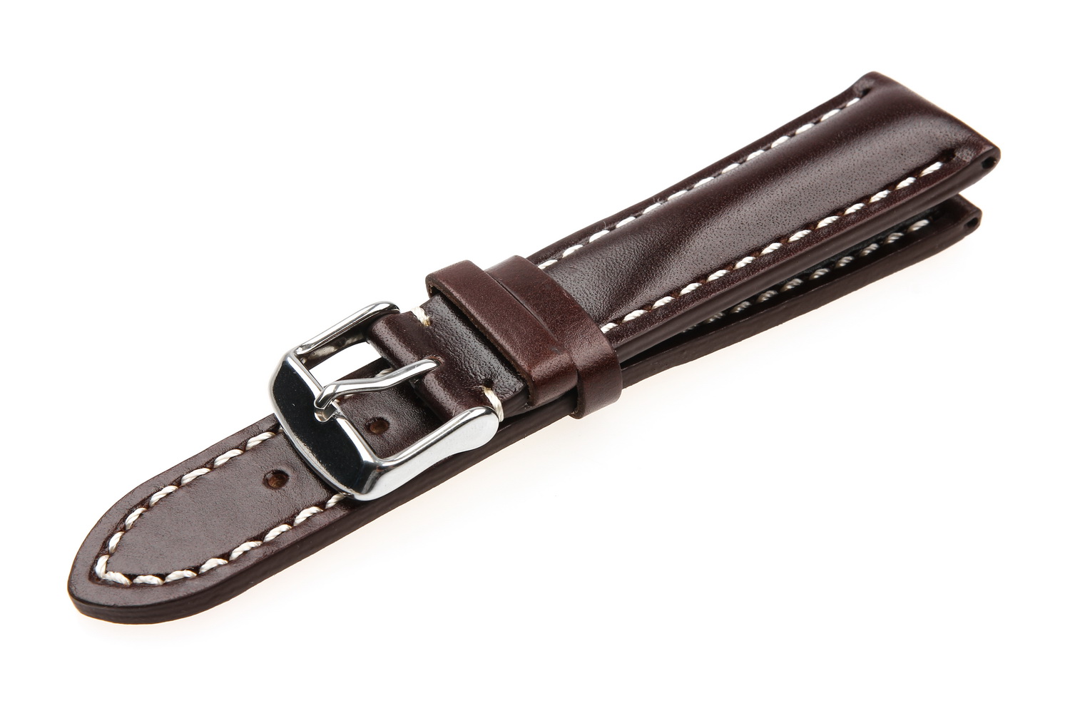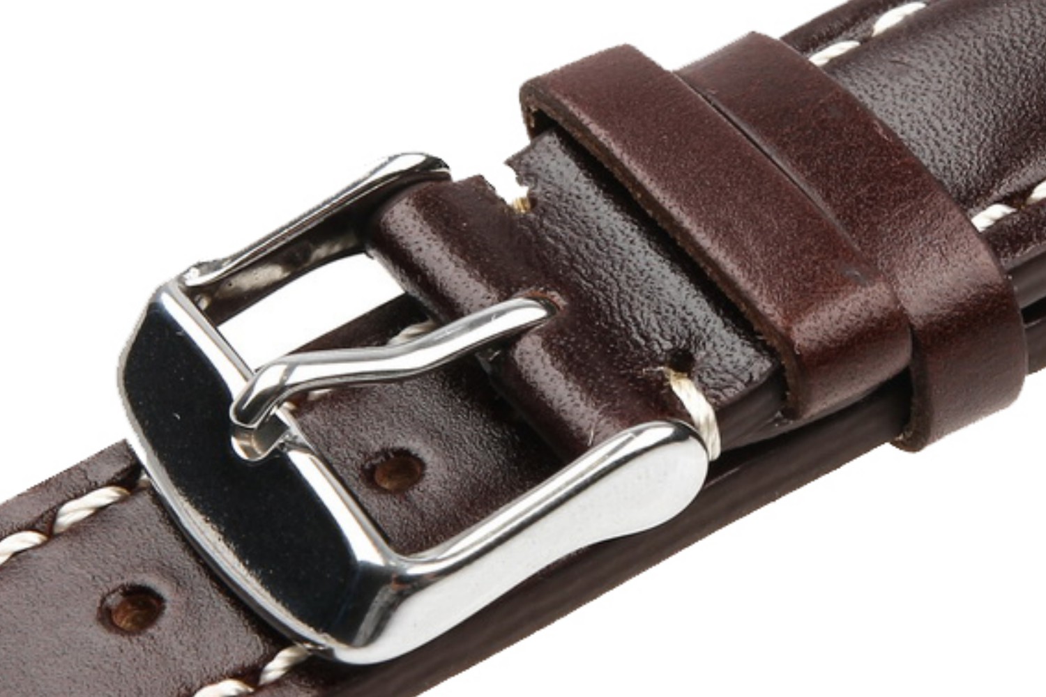 Gładki pasek ze skóry cielęcej, gładkie szycie, szew w białym kolorze, klasyczna klamra z bolcem