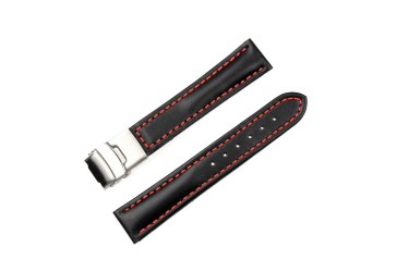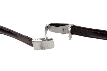 Wyścielany skórzany pasek o sportowym wyglądzie, gładki, góra z cielęcej skóry, spód ze skóry cielęcej typu nubuk, druga szlufka specjalnie szyta, w dwóch wariantach: z delikatnym szwem w kolorze czerwonym, klasyczna klamra z bolcem