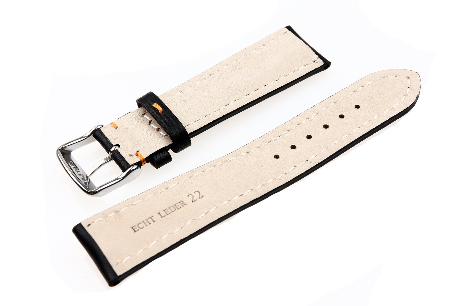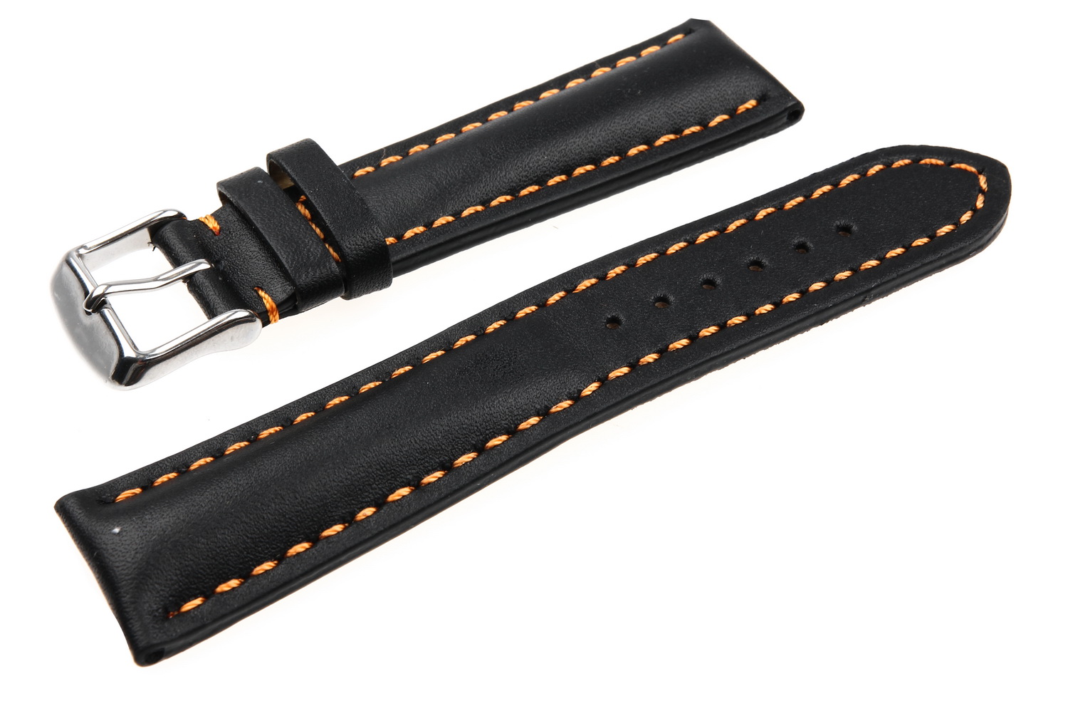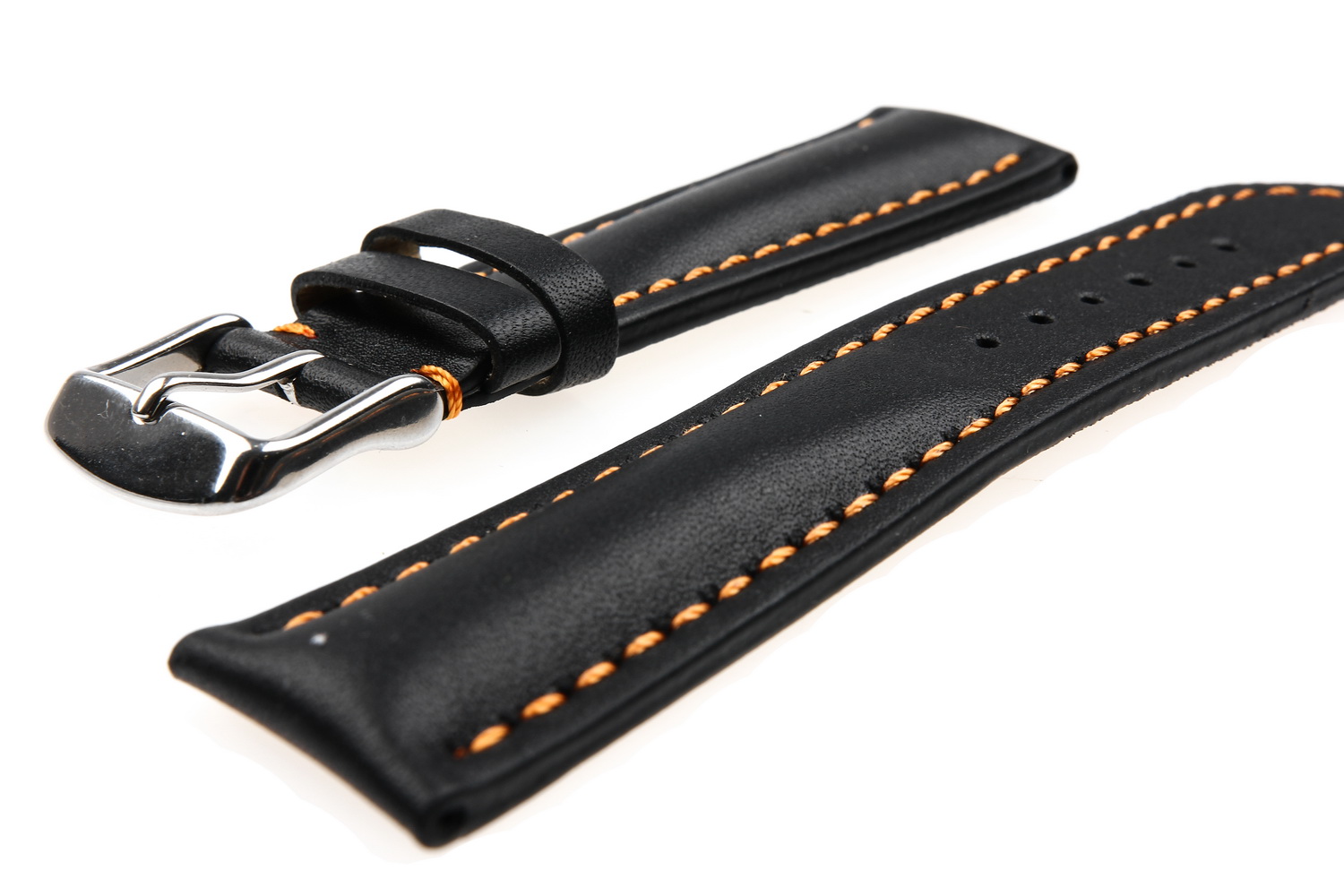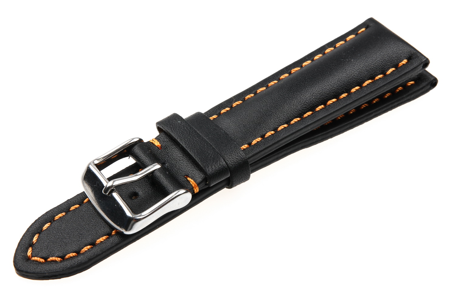 Bardzo miękka francuska skóra cielęca, spód ze skóry typu nubuk, druga szlufka specjalnie szyta, gładki, czarny, z pomarańczowym szwem, klasyczna klamra z bolcem