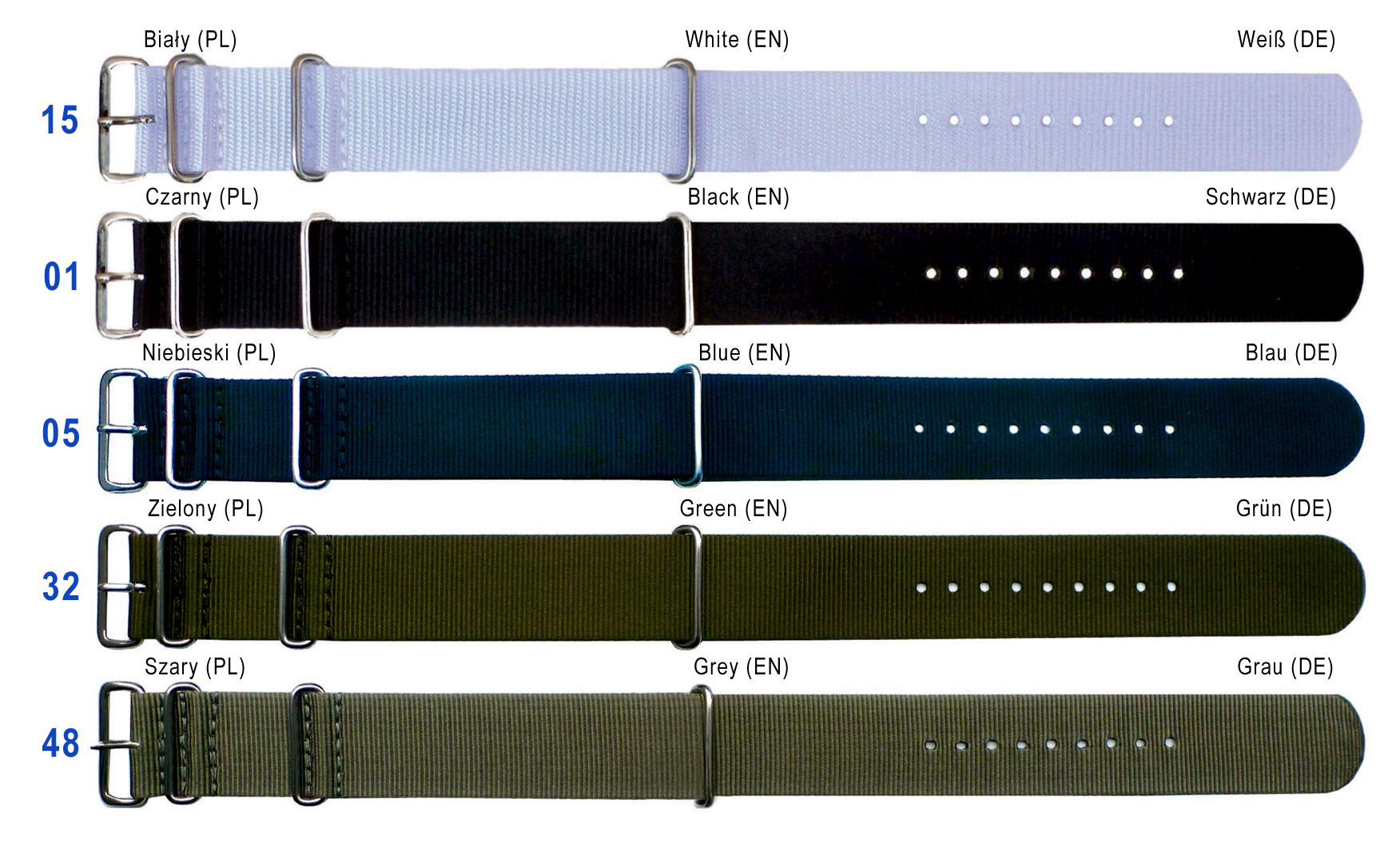 • Design: Pasek z poliestru w 4 różnych szerokościach i 5 kompozycjach kolorystycznych