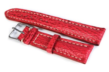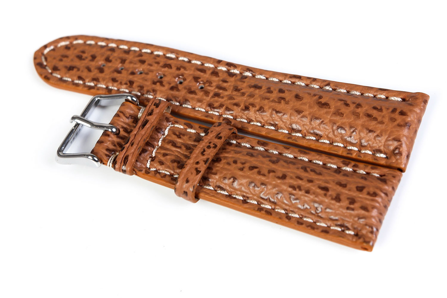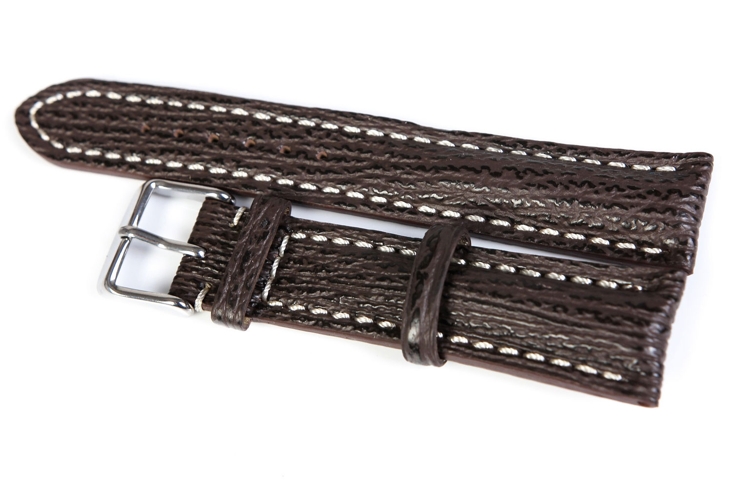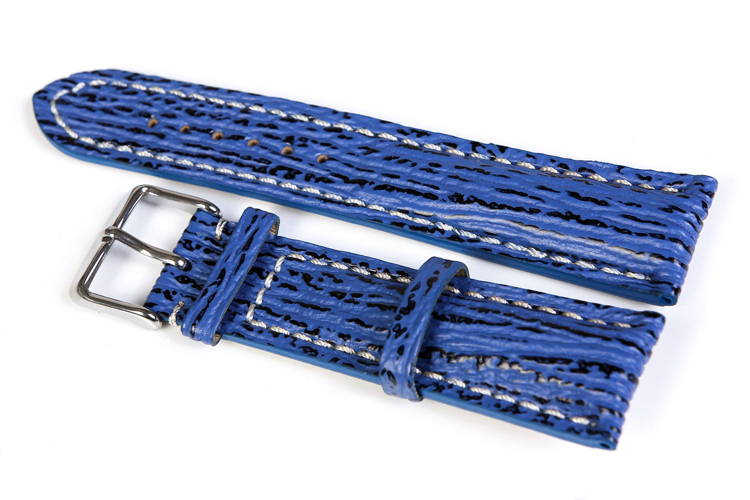 Góra ze skóry rekina, biały szew kontrastowy, mocno wyścielany, spód z cielęcej skóry typu nubuk, druga szlufka specjalnie szyta, tłoczony wzór, klasyczna klamra z bolcem