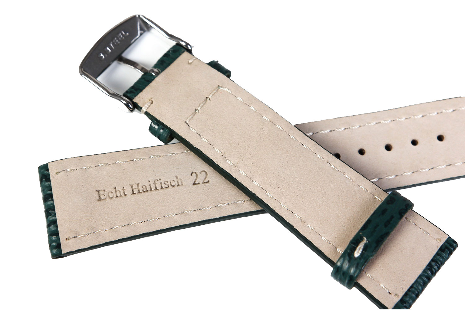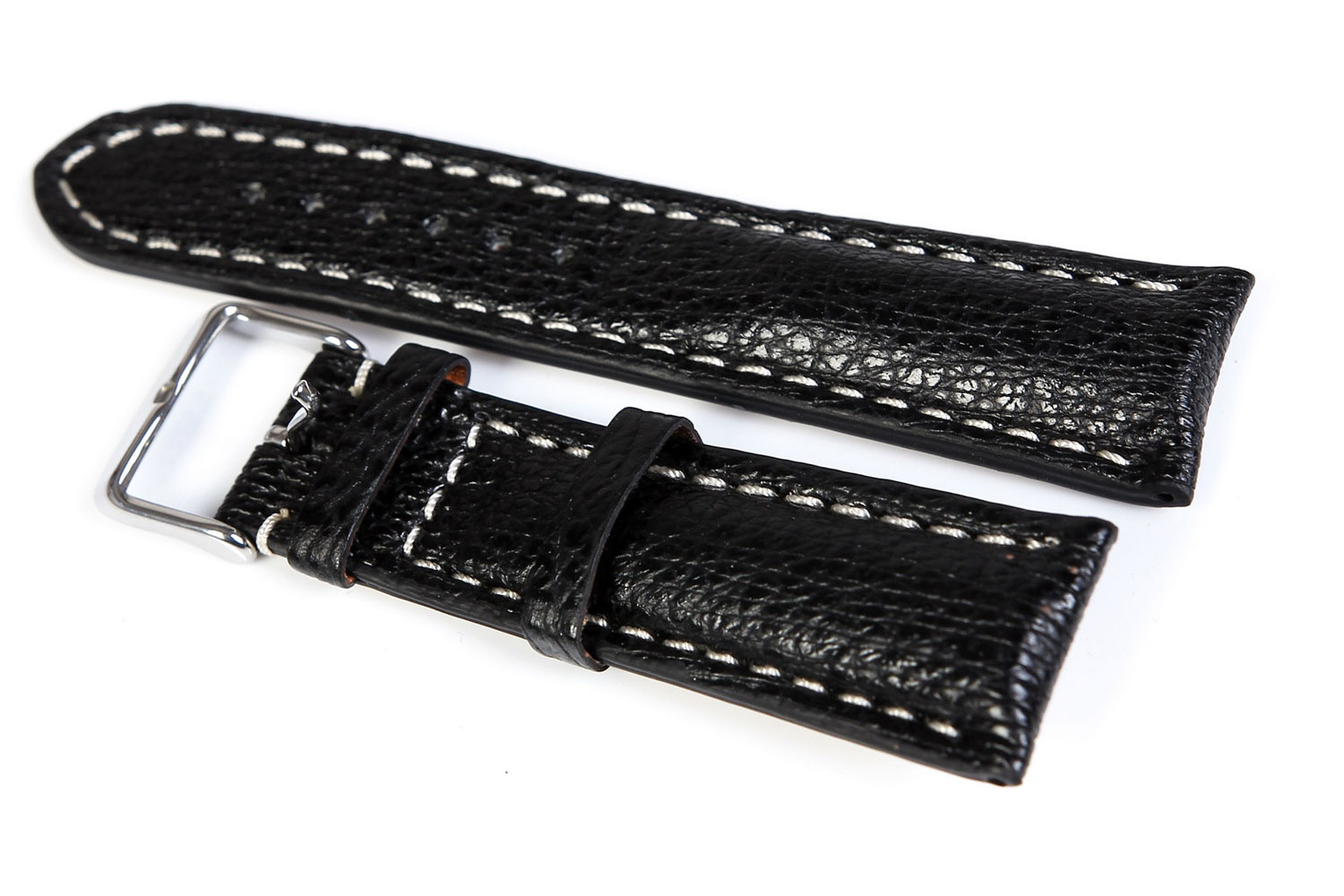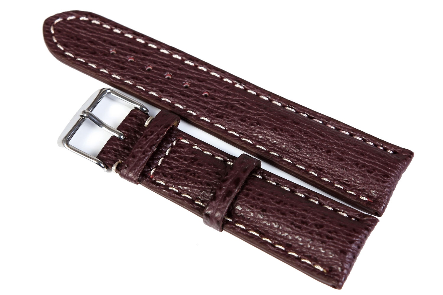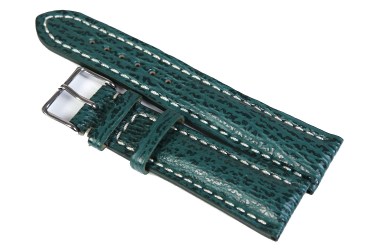 Góra ze skóry rekina, biały szew kontrastowy, mocno wyścielany, spód z cielęcej skóry typu nubuk, druga szlufka specjalnie szyta, tłoczony wzór, klasyczna klamra z bolcem
